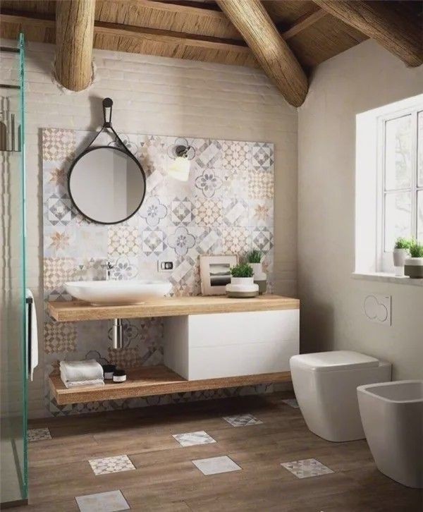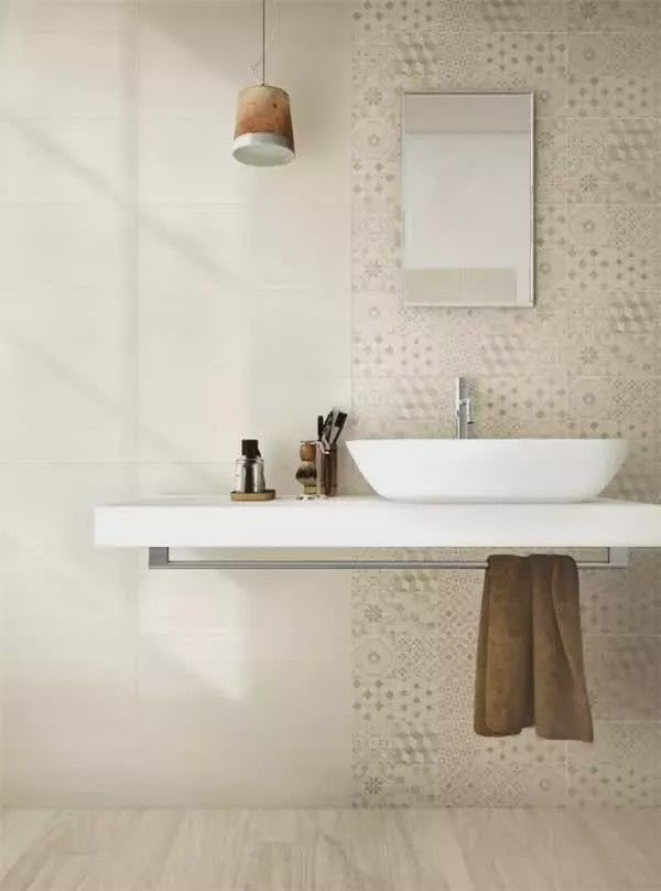 地面与墙面选择同款花砖,令空间产生上下联动的统一感,花色尽量不要过于复杂,或者是选择局部铺贴。