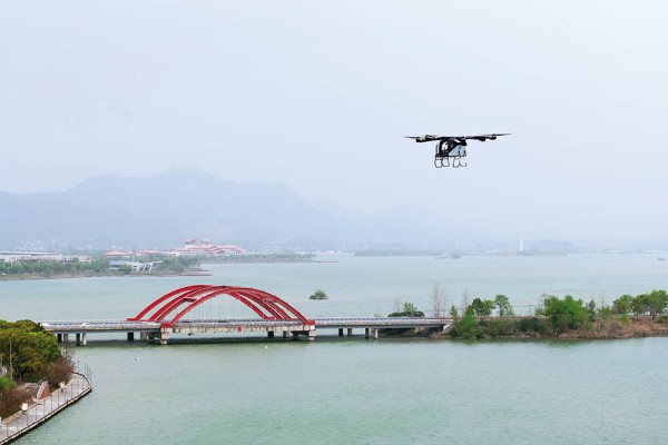 3月27日,小鹏汇天“陆地航母”飞行汽车飞行体在湖南常德柳叶湖旅游度假区进行飞行演示(无人机照片)