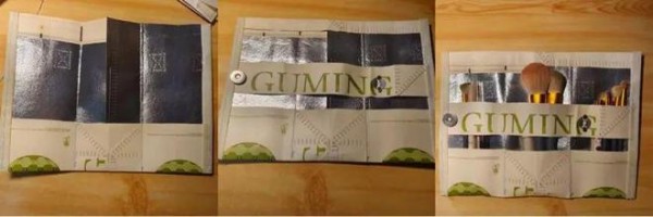 如果担心化妆刷放进去乱跑的话,可以拿出刚刚剪下来的侧边,直接横着固定到中间。一个简约版的化妆刷收纳袋就做好啦~