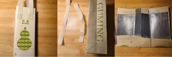 然后把上面的封口粘好,正面的提手剪掉,再向上折出一个口袋,接着用胶水固定口袋的侧面。