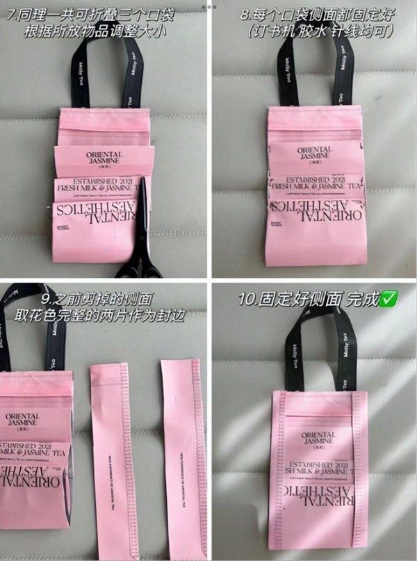 再把提手部分剪掉,粘到袋子下半部分,或者直接拿订书机钉上去,效果也是一样的。