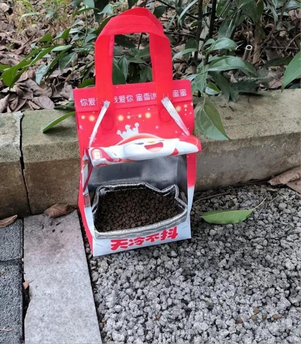 想给小区的流浪猫放点猫粮,但怕下雨天淋湿,家里屯的奶茶袋又派上用场了。