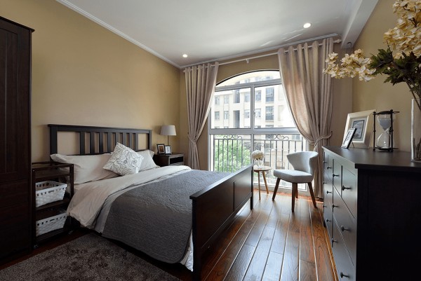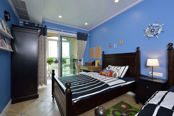 卧室采用的是比较硬朗的色系,门框、衣柜以及家具都具有硬朗利落的线条,横竖交织,简约但不乏味,次卧作为男孩子的房间将整个墙面颜色改为蓝色也毫不违和,小阳台上的花园设计用绿植点缀出了卧室的活力与生机,街上的景色透过窗户照进室内,一片祥和活泼的景象。