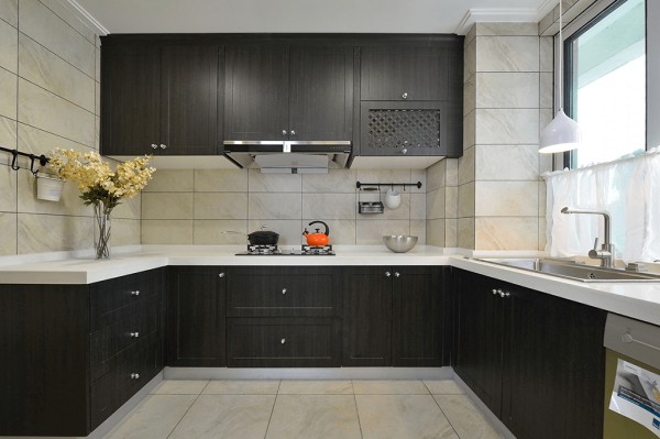 厨房以黑白两色为底色,U型的台面让各个区域之间的操作与联系更加流畅,半开放式的设计配合推拉门,完美隔绝厨房油烟又不影响连接餐厅的交流。