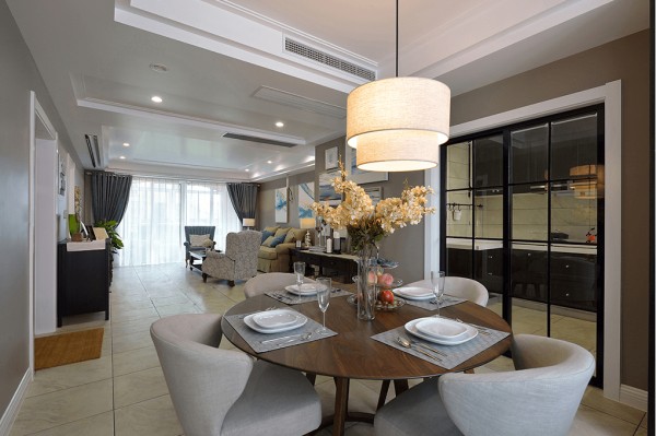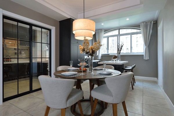 餐厅区的开放式格局让整个客厅餐厅一体的区域更加敞快透亮,在视觉上扩大了空间,没有了墙面的阻隔增加了一家人共处的时间,提升居住幸福感,圆形的餐桌椅,设计感十足的吊灯和餐桌上的小装饰都让整个餐厅充满着简约的艺术气息。