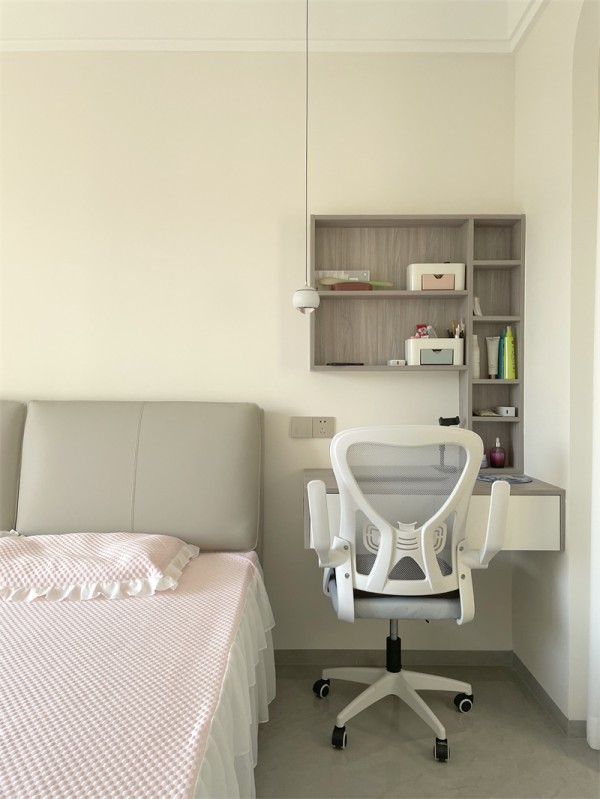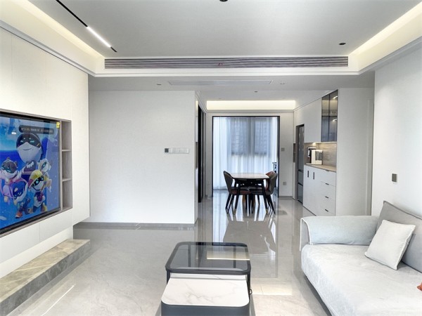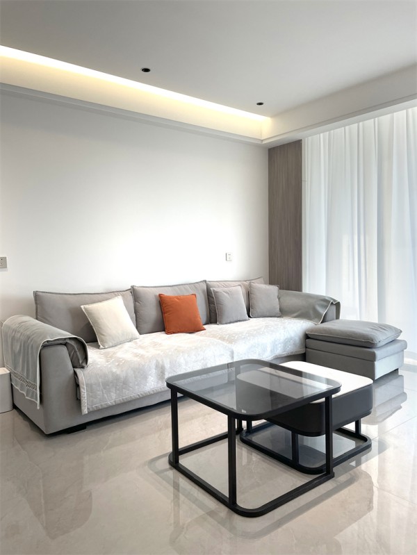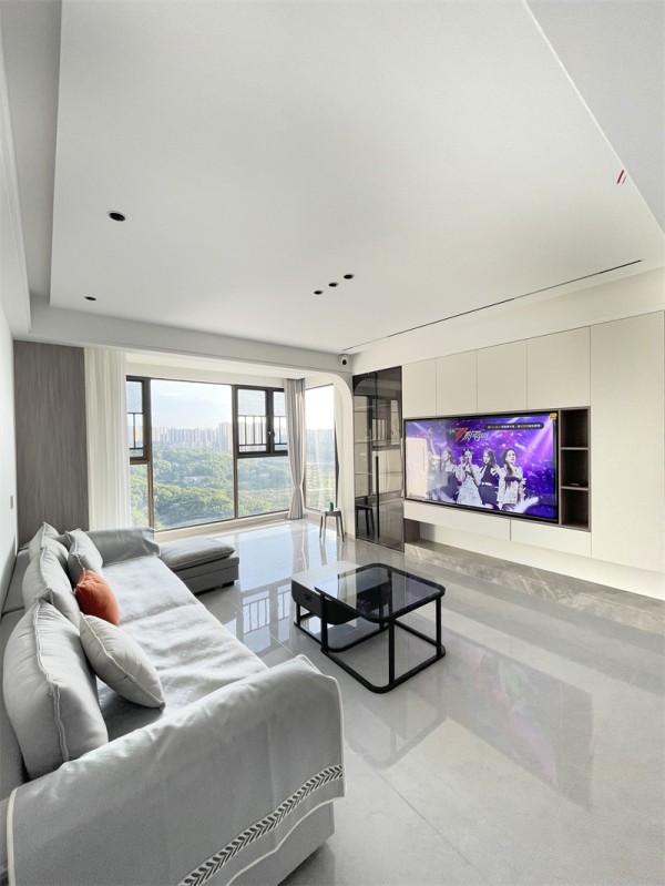 全房地面通铺,无主灯吊顶,阳台的圆弧增加一丝小调皮。内嵌挂式电视架,不论在餐厅还是在沙发上,都能方便的调节观看角度。地砖和浅灰沙发的搭配是一大亮点,简约大气,客厅运动空间大,平时一家人休闲娱乐都很舒适。