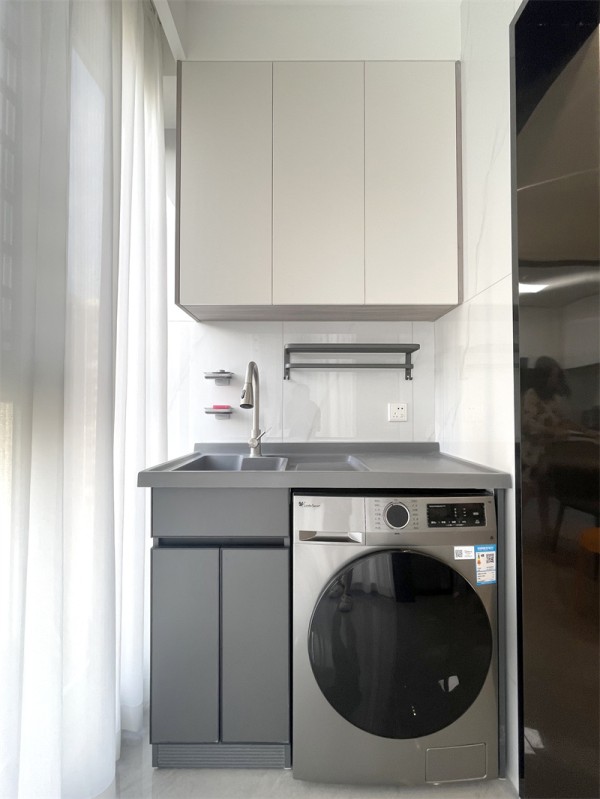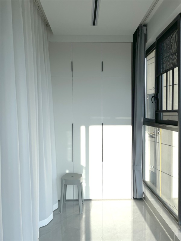 双阳台南北通透,生活阳台纱窗帘增加私密性,阳台吊柜+洗衣柜搭配+休闲阳台超大超深储物柜,家里在多电器也能放得下。双阳台都装了晾衣架,休闲阳台隐藏晾衣架,客厅与阳台纱隔断,意境、隐私两不误。
