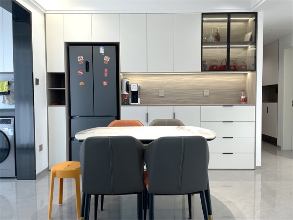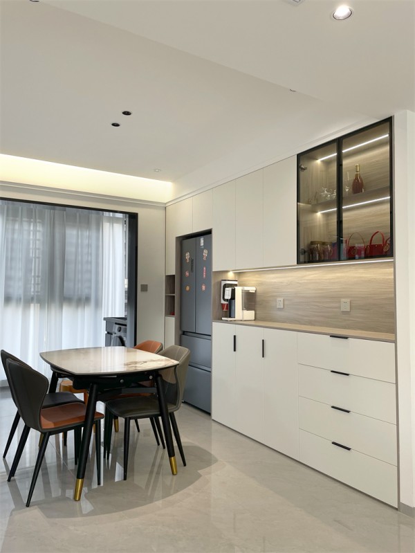 嵌入式样冰箱与餐边柜融为一体,餐厅区域更方正,吊顶灯光槽和餐边柜内灯带相呼应,让就餐氛围感满级。
