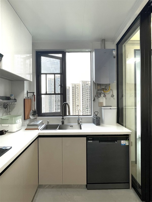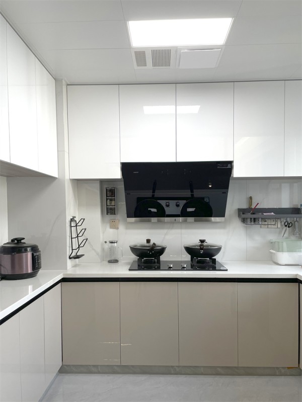 厨房吊柜亮白色搭配卡其灰,整个色系亮堂,U字型的设计,各种厨房电器分区。厨房无地轨吊轨门让厨餐可一体,活动空间增大。
