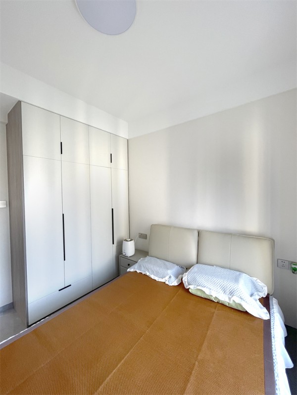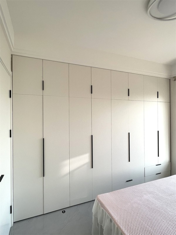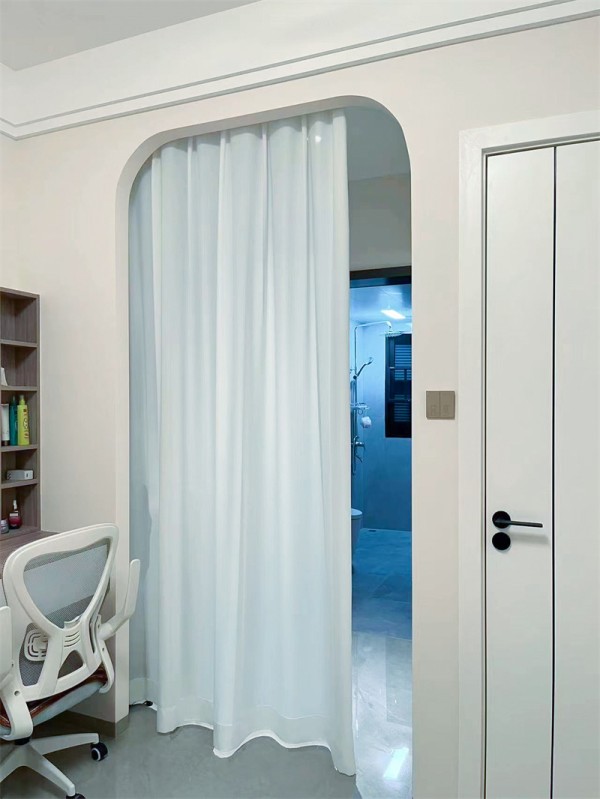 全房现场木工衣柜结合定制柜门,整墙的大衣柜让整个家显得精致大气高端,舒适惬意又有着浓浓的的时尚、书香、文化气息。主卧开放式造型衣帽间即好看又以纱帘隔断卫生间门,挂放常用衣服方便实用。