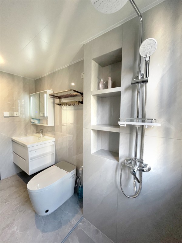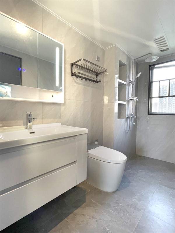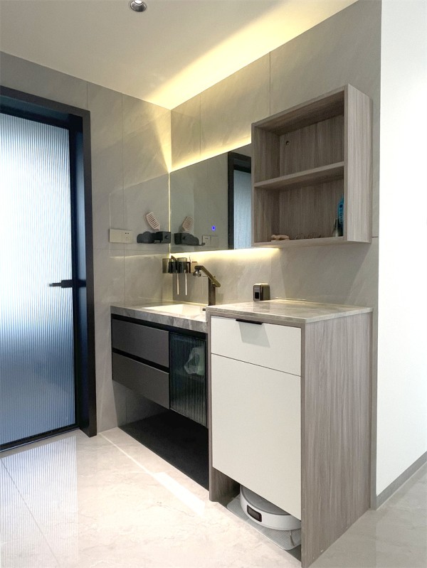 洗漱干区拆墙扩大面积,高低大理石台面与洗漱盆结合,柜内安置了扫地机器人的家,卫生间壁龛,洗漱盆开格朝向,都增加了置物空间。