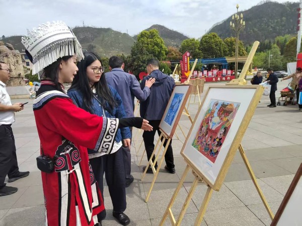 在“农民画里话文明”系列活动中,苗族绣娘指尖翻飞,将文明标语绣入背扇纹样;布依族老人用枫香染技艺绘制《二十四节气农耕图》;孩子们用粽叶编织“文明礼仪”主题草编……现场还展示了彝族彩布贴花、新街面塑、苗族服饰等非遗艺术品,通过“农民画+非遗”的立体呈现,将抽象的文明理念化作可观、可感、可体验的文化符号,真正走进群众生活,让文明新风“活”起来。