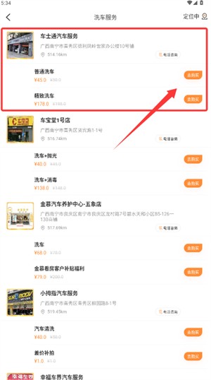 3、在洗车服务列表中,根据需求筛选商户与项目,点击购买按钮完成操作。