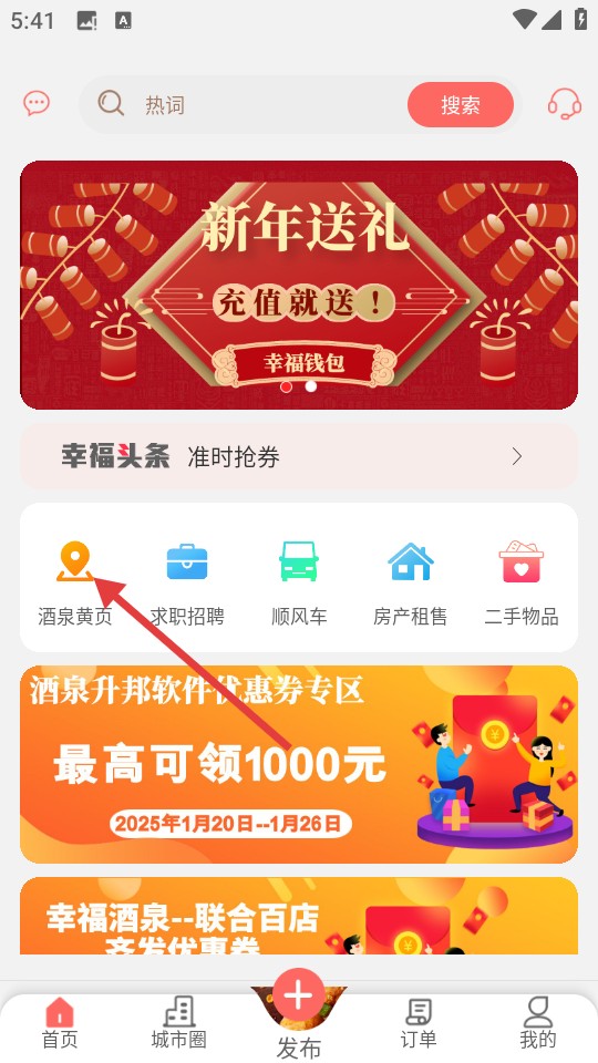 2、在APP首页,点击【酒泉黄页】功能入口。