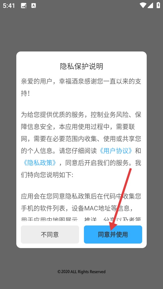 1、阅读《用户协议》和《隐私政策》,点击【同意并使用】,进入APP。