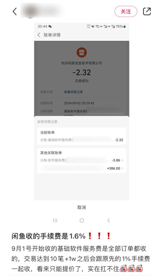 9月3日,有卖家在社交平台晒出订单,买家购买了一个386元的商品后,他向闲鱼付了2.32元的基础服务费和3.86元的软件服务费,也就是说,闲鱼最高向卖家收取1.6%的服务费。