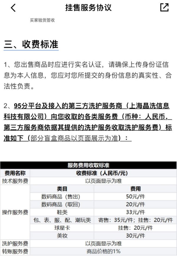 比如潮流装备交易平台得物以及旗下的二手交易平台95分都会收取一定的服务费。以95分为例,95分将收取20至50元不等的操作服务费、1%的商品转账服务费以及一定的技术服务费和转账服务费。当然,与闲鱼相比,95分收到的产品需要根据95分平台的要求进行查验,查验通过后才会向买家发货。