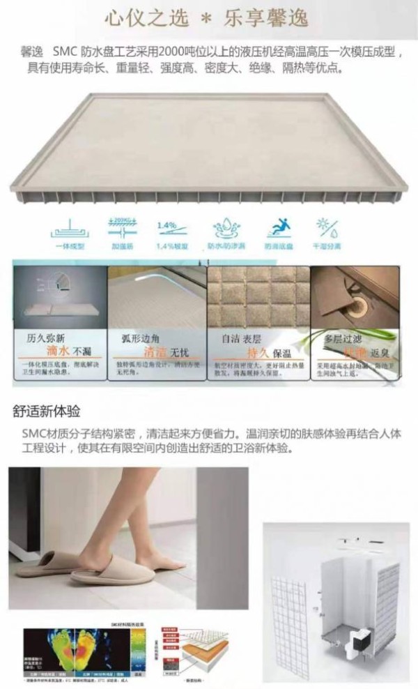 馨逸整体卫生间,颠覆传统装修理念和方式,通过专业的集成化创新,依托“住宅产业化”和“家居智能”的理念,实现住宅装修快速化、标准化,家居生活科技化、舒适化,让用户乐享科技、健康、愉悦的居家体验。 馨逸整体卫生间的底盘、墙板等主体材料均是用SMC材料模压而成。SMC材料 广泛应用于制造运载火箭壳体,飞机机舱等航天领域,具有***的耐用性。产品经高温高压一次模压成型(2500吨压力),***消除了传统的卫生间渗漏隐患。具有洁净干爽,不留异味、防滑保温等优点。为您提供整体设计,整体安装,整体售后的一体化贴心服务。 ? 馨逸定位整体卫生间中高端市场,汇聚中国整体卫浴行业中最***的研发、生产及服务团队,以及室内空间设计师团队,根据中国用户和市场的实际需求,针对性研发、创新开发,满足房地产精装修用户的产业化装修需求。通过不断的产业升级与创新,形成SMC成熟的整体卫浴产品,来满足市场全方位需求。