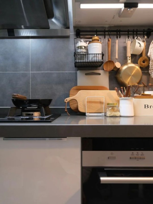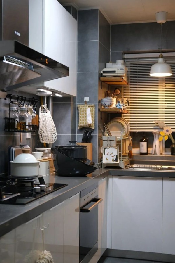 虽然豌旎家的厨房非开放式,但也要面对小空间和开放置物的油烟问题。根据生活经验,厨房的卫生,还是要遵循定期清洁,避免常年累积油污的现象,就像台面,一开始就选了深灰色石英石,本身相对耐脏,每次做完饭用厨房去污纸清理干净,随用随清,入住了两年多来,台面和墙面基本上没有太多油污残留,家里灰色墙砖的美缝依旧还是白白的。