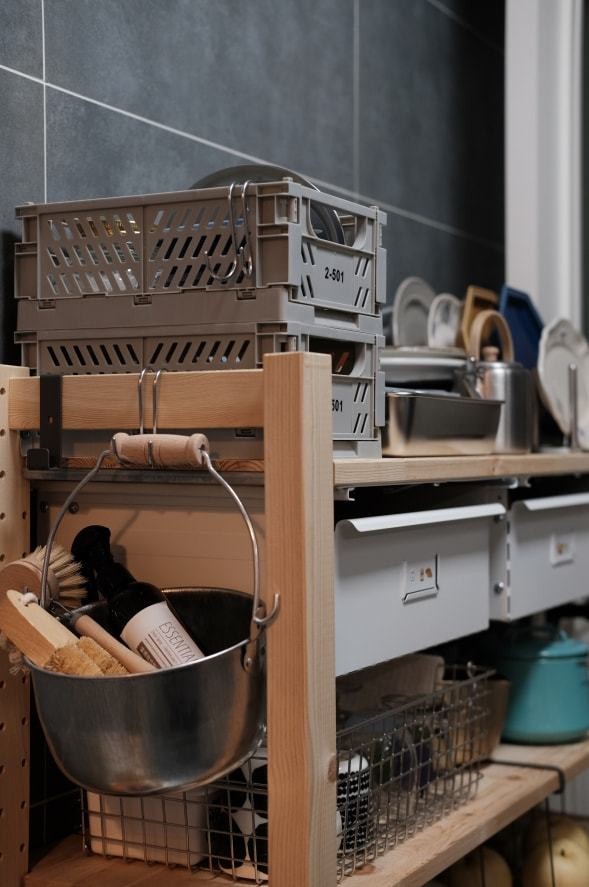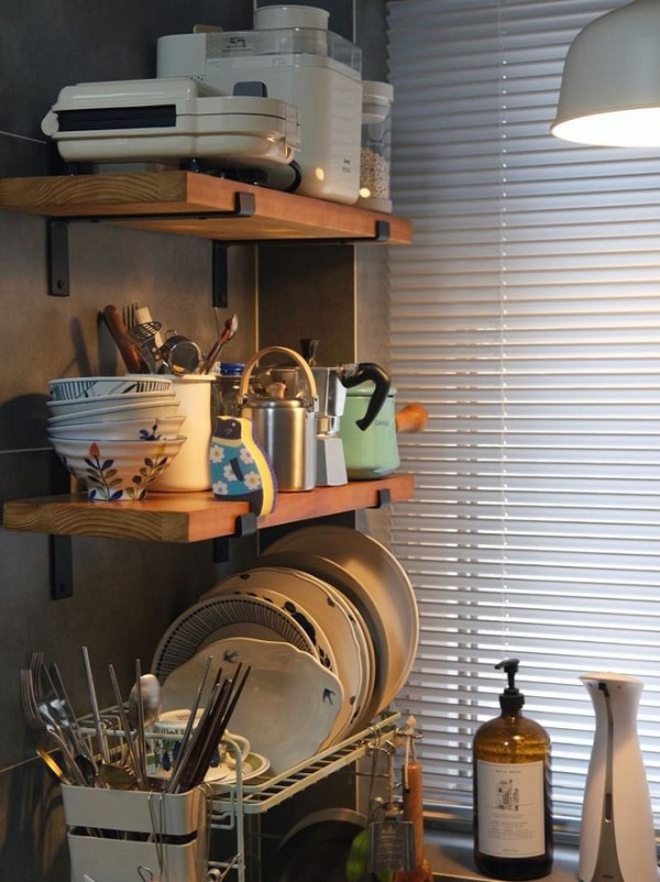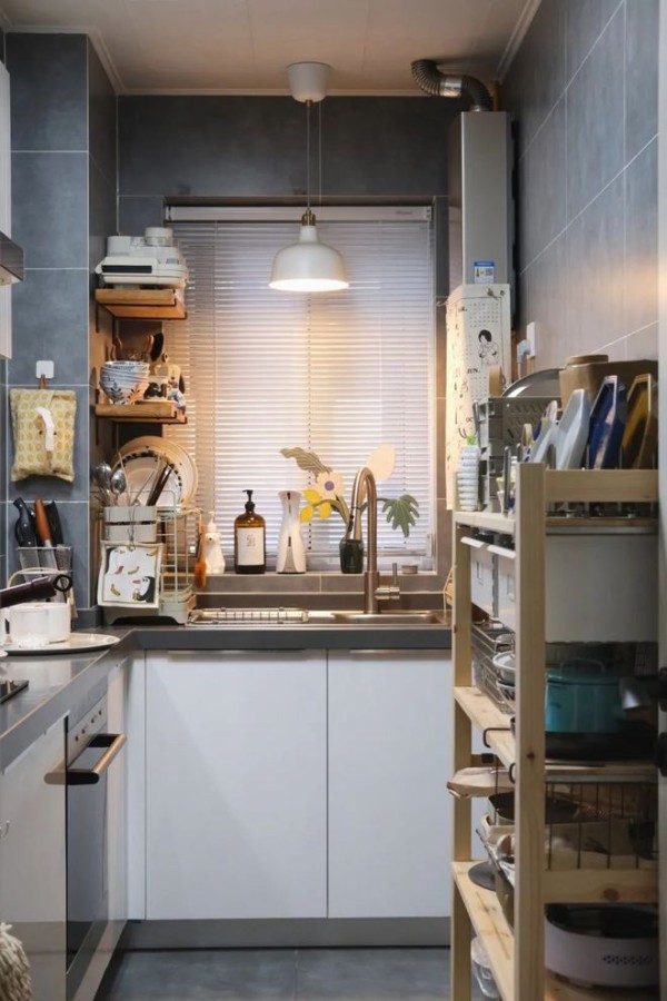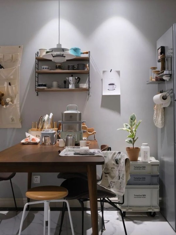 橱柜对面还放置了宜家的伊娃系列置物架,开放式收纳对日杂风格有很大的加持,那种看似凌乱其实暗藏秩序的方式,让人在一众美物中感受着温暖的点滴日常,同时很大程度上解决了小户型厨房的收纳问题。