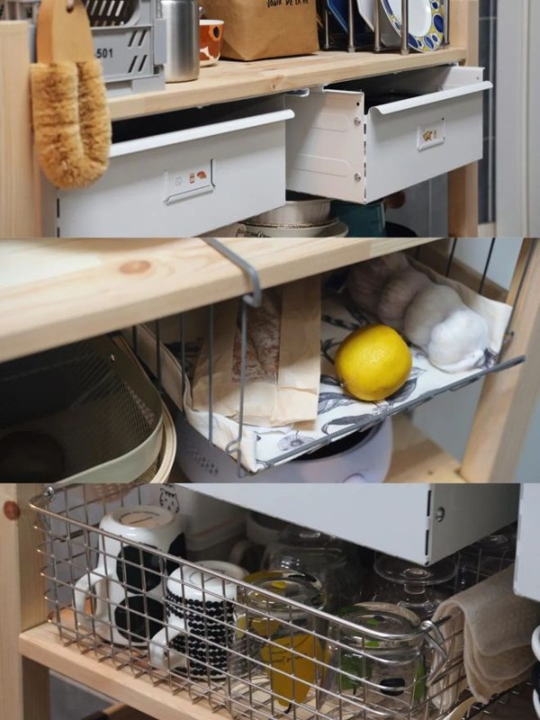 宜家伊娃开放置物架:非常适合收纳空间有限的厨房。并且可以搭配抽屉、网篮、酒架等各种收纳配件来使用。