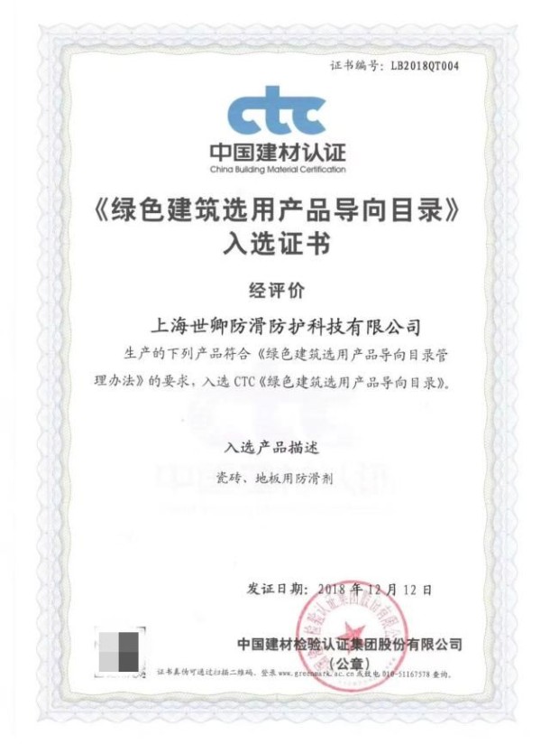 《绿色建筑选用产品》认证不仅是对世卿地面防滑剂技术创新和质量管理体系的高度肯定,更是对其在环保、可持续发展方面所作努力的认可。这一认证为世卿在市场上树立了强有力的品牌形象,进一步增强了企业在行业内的影响力和竞争力。消费者和合作伙伴对绿色、环保产品的关注日益增加,世卿地面防滑剂凭借这一认证,在众多同行中脱颖而出,成为了客户和市场优先选择的品牌。