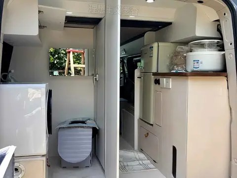 车身左侧做了一排木质储物柜,从零食、露营装备到换洗衣物,都能分门别类放好,看着清爽不杂乱。车尾则藏着一个“迷你厨房”:小冰箱能冰饮料、水果,电饭锅能煮饭、煮粥,旁边还有一个小小的操作台,切菜、洗菜都有地方。最让人惊喜的是,它还带了一个完整的卫生间——有淋浴、有马桶,还有一个小洗衣机,就算在外面住一周,也能保持干净整洁,完全不是“凑活住”的状态。