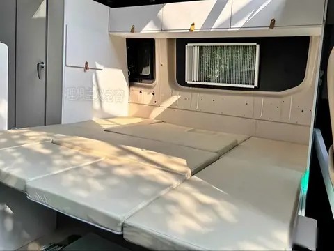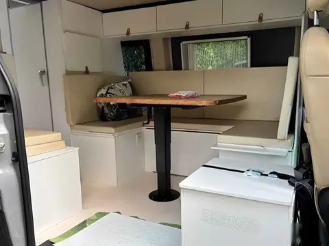 走进车内,首先看到的是后排的U型沙发,中间配了一张可升降的小桌子。白天把桌子升起来,能吃饭、打牌、用电脑办公;晚上把桌子降下去,沙发靠背放平,直接拼成一张1.8米的大床,两个人睡完全不挤,不用再像以前那样搭帐篷、铺睡袋,累了就能直接躺平。