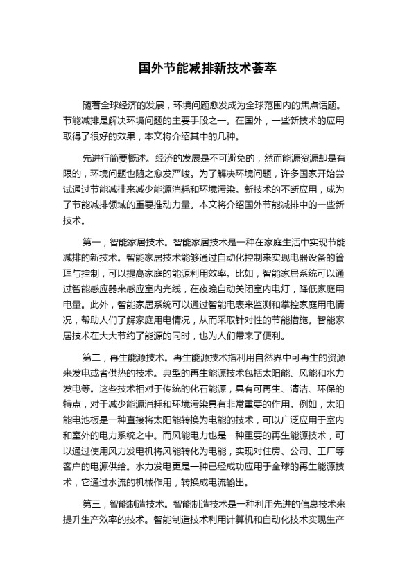 国外节能减排新技术荟萃 随着全球经济的发展,环境问题愈发成为全球范围内的焦点话题。节能减排是解决环境问题的主要手段之一。在国外,一些新技术的应用取得了很好的效果,本文将介绍其中的几种。 先进行简要概述。经济的发展是不可避免的,然而能源资源却是有限的,环境问题也随之愈发严峻。为了解决环境问题,许多国家开始尝试通过节能减排来减少能源消耗和环境污染。新技术的不断应用,成为了节能减排领域的重要推动力量。本文将介绍国外节能减排中的一些新技术。 第一,智能家居技术。智能家居技术是一种在家庭生活中实现节能减排的新技术。智能家居技术能够通过自动化控制来实现电器设备的管理与控制,可以提高家庭的能源利用效率。比如,智能家居系统可以通过智能感应器来感应室内光线,在夜晚自动关闭室内电灯,降低家庭用电量。此外,智能家居系统可以通过智能电表来监测和掌控家庭用电情况,帮助人们了解家庭用电情况,从而采取针对性的节能措施。智能家居技术在大大节约了能源的同时,也为人们带来了便利。 第二,再生能源技术。再生能源技术指利用自然界中可再生的资源来发电或者供热的技术。典型的再生能源技术包括太阳能、风能和水力发电等。这些技术相对于传统的化石能源,具有可再生、清洁、环保的特点,对于减少能源消耗和环境污染具有非常重要的作用。例如,太阳能电池板是一种直接将太阳能转换为电能的技术,可以广泛应用于室内和室外的电力系统之中。而风能电力也是一种重要的再生能源技术,可以通过使用风力发电机将风能转化为电能,实现对住房、公司、工厂等客户的电源供给。水力发电更是一种已经成功应用于全球的再生能源技术,它通过水流的机械作用,转换成电流输出。 第三,智能制造技术。智能制造技术是一种利用先进的信息技术来提升生产效率的技术。智能制造技术利用计算机和自动化技术实现生产过程的智能化,可以大大提高生产效率,减少生产过程中的浪费。例如,智能制造技术可以通过批量生产方式来降低生产成本,同时减少生产过程中的污染和能源消耗。此外,智能制造技术还可以提高产品的质量和可靠性,从而减少对环境的不良影响。因此,智能制造技术成为了未来节能减排的趋势之一。 总之,国外上述的新技术为环保提出解决方案,成为了节能减排的重要推动力量。随着全球环境问题日益严峻,更多新技术的问世将会更大限度地节约能源与降低环境污染。