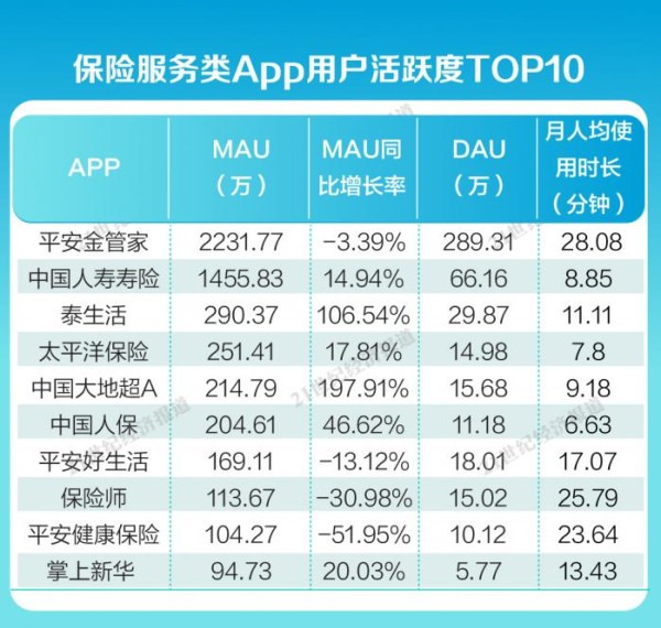 21世纪资管研究院结合QuestMobile数据,从MAU、DAU、活跃渗透率、月人均使用时长、月人均单次使用时长等因素,综合评价用户活跃度较高的保险服务类App前十名分别为: