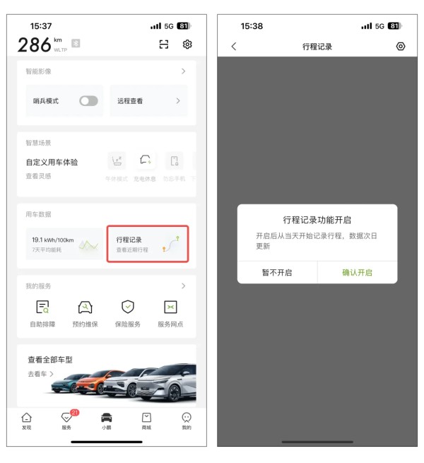 现阶段仅限绑定车辆的车主账号查看行程记录,关闭功能或换绑车主账号后,将停止记录并清空行程数据。打开小鹏汽车APP,点击小鹏汽车App车控页—用车数据—行程记录,之后会有一个确认开启的弹窗,点击确认后就算是正式开通啦!