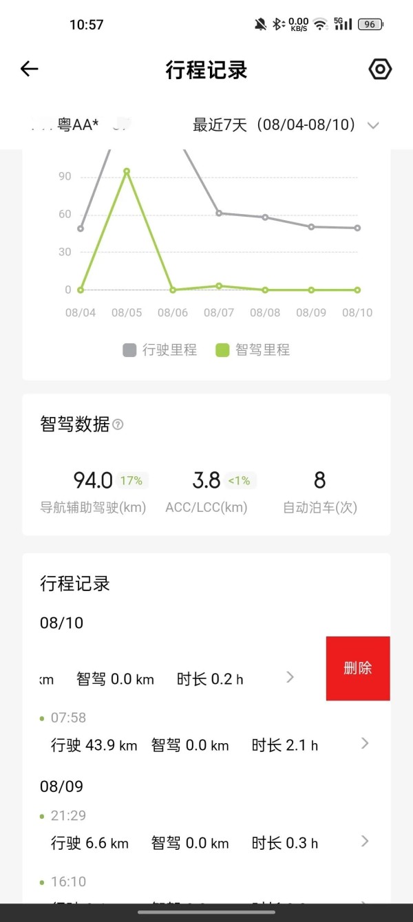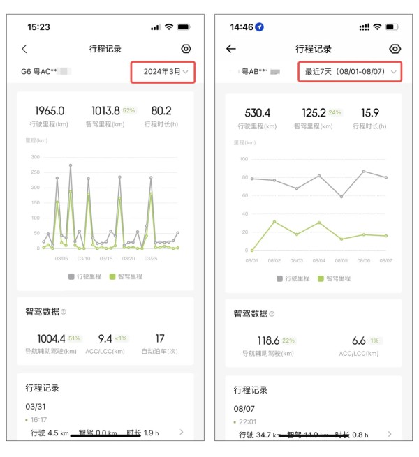 开通后 ,你可以查看近三月以及最近一周的行程记录,其中包含总的行驶里程和行程时长,以及详细的智驾数据。