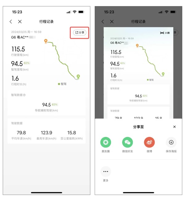针对单条行程,你也可以点击分享按钮进行分享,去和鹏友比一比,看看谁才是真正的智驾之王!