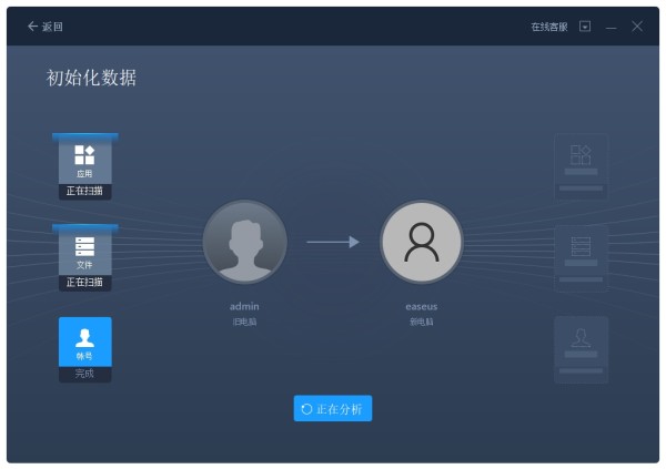 (1)易我电脑迁移将开始枚举源计算机中所有可以传输的应用程序、数据和账号。此过程将花费一些时间,并且速度因数据量和计算机性能而异。