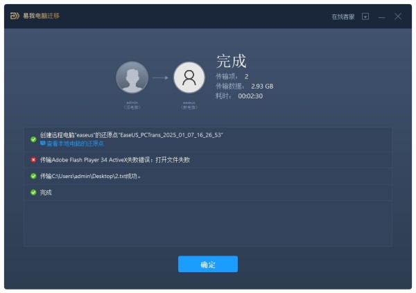 ◆迁移完成后,点击“确定”。需要重新启动计算机以刷新所有传输的信息。