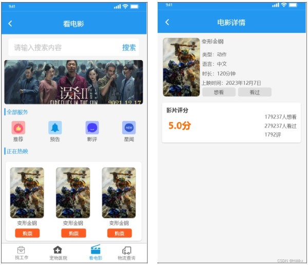 2.电影信息详情页分别展示电影封面图片、电影名称、评分、上映时间、想看人数等信息。