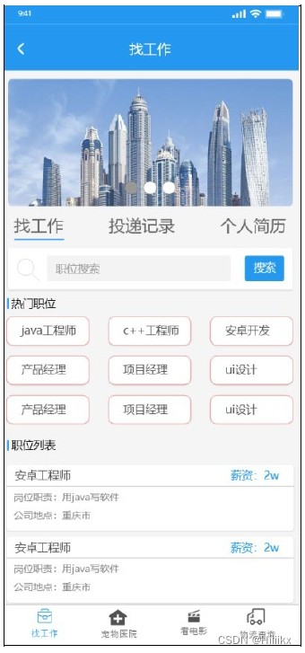 1.点击底部导航栏“找工作”,进入找工作页面,页面具备宣传幻灯片、职位搜索框、热门职位、职位列表显示功能。