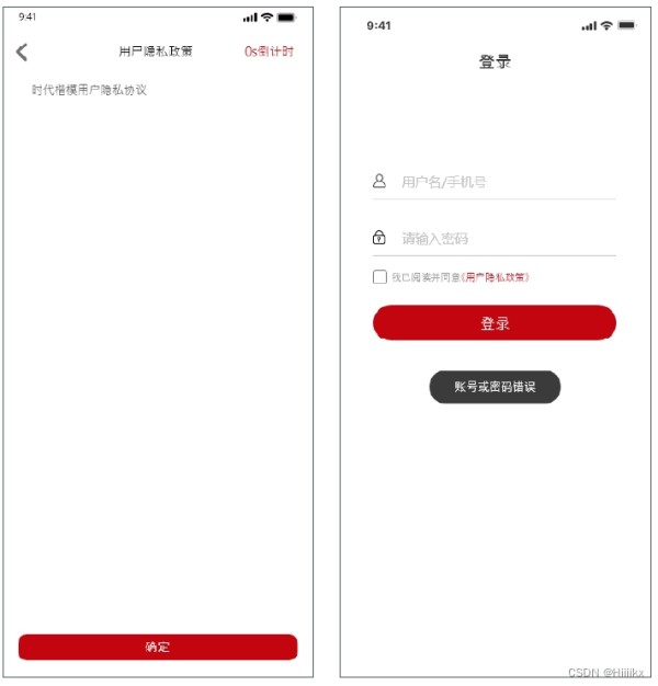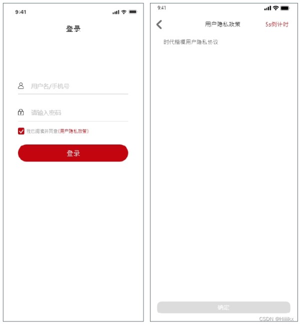 1.打开App首先进入登录页面,页面上方显示用户名和密码输入框,输入框下方显示登录按钮和隐私协议复选框。点击隐私协议复选框时或者在点击登录按钮时没有选择我已同意复选框的情况下,会弹出用户隐私政策页面,在页面右上角显示5秒倒计时,倒计时结束前确认按钮不可点击,倒计时结束后可以点击下面的【确定】按钮,关闭弹出框,同时隐私协议复选框状态变为已勾选状态,点击【登录】按钮进行登录操作,如果登录成功则跳转至App主页面,如果登录不成功,用消息框显示登录失败的原因。