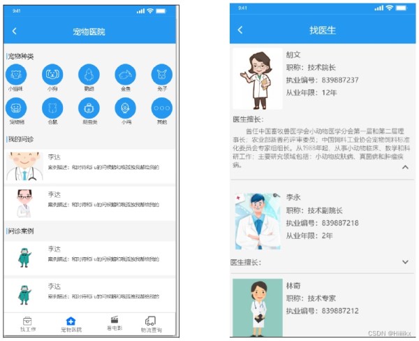 2.找医生页面,页面显示医生列表,列表项左侧显示医生头像、右侧显示医生姓名、职称、执业编号、从业年限。