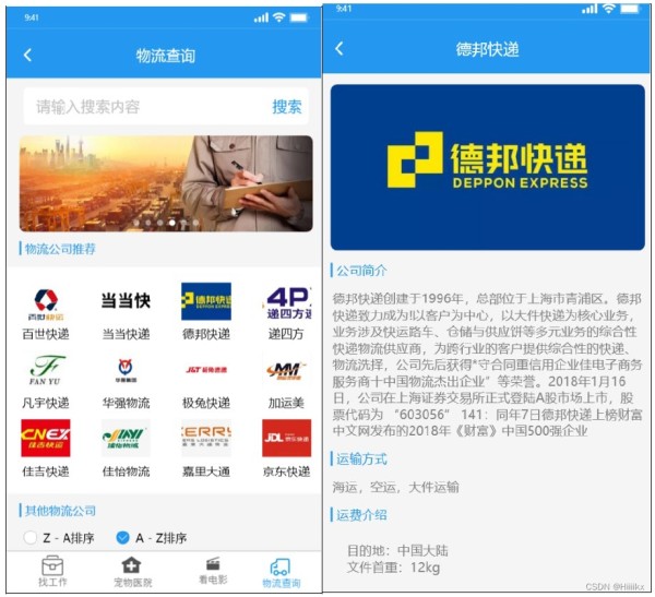 1.点击底部导航栏“物流查询”,进入物流查询页面,页面包括搜索输入框、广告轮播图、物流公司推荐、下方显示物流公司列表,列表项显示物流公司名称和缩略图。