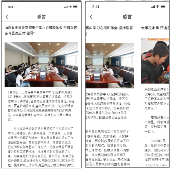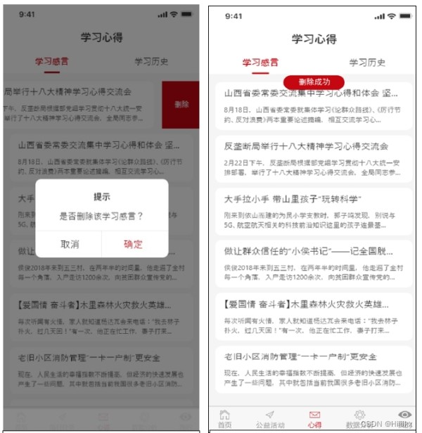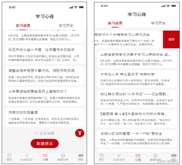 2.学习感言列表包括感言标题、感言内容(字数过多使用...代替),默认显示10条数据,当页面上滑至底部时显示“图标动画+正在加载...”,并继续进行查询,每次添加10条数据,所有数据全部加载完成后,在底部显示“没有更多数据了”字样,左滑列表项时显示“删除”按钮,点击该按钮弹出对话框,对话框文字内容为:“是否删除该学习感言?”,下方包含“确定”和“取消”按钮,点击“确定”,删除该条学习感言,删除成功后显示“删除成功”字样并关闭对话框,点击“取消”则仅关闭对话框,(可以在不调用感言信息删除接口的情况下,实现该条信息假删除效果即可)。点击列表项,进入学习感言详情页面,页面包含学习感言的图片、标题、内容等信息,左滑/右滑可以切换至下一条/上一条学习感言详情。
