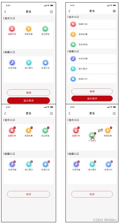 3.显示App各领域应用服务入口,以图标和名称为单元宫格方式显示,手机端每行显示3个,包括楷模列表、英雄故事、身边英雄、物资捐赠、群众需求、更多。每个领域应用入口布局显示为圆形图标+名称布局,点击图标可进入对应的领域应用页面。当点击“更多”入口时,进入管理应用服务入口页面,显示所有入口icon(不包含“更多”入口)。页面上半部分展示“显示入口”,包括楷模列表、英雄故事、身边英雄的入口图标,边框带有颜色。下半部分展示“隐藏入口”,包括物资捐赠、群众需求、数据分析的入口图标,点击入口图标跳转至对应的功能页面,点击“退出登录”时,跳转至登录页面。点击“编辑”按钮时,进入编辑模式,“显示入口”图标右上角有减号icon,点击减号,对应领域应用入口图标移动到页面下方区域,点击“保存”按钮,首页快捷入口发生变化。页面下半部分“隐藏入口”,右上角有加号icon,点击加号,图标移动到页面上方区域,点击“保存”按钮,首页快捷入口发生变化。长按领域应用入口图标,图标弹起,可拖动重新排序图标。