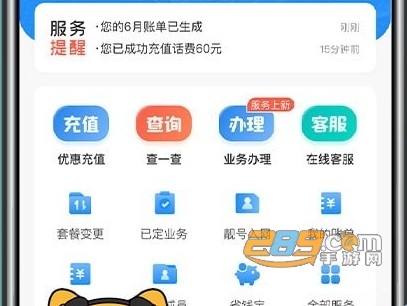 常用服务、话费充值、便捷查询、业务办理、客服咨询,版块清晰,快捷办理。