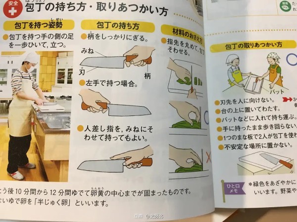 吃:日本从北到南,口味上可能会有地域性差异,但饮食结构基本是一样的,加上分餐制,家庭做饭基本上都是三菜一汤加米饭主食的标配,很简单。五年级的孩子要开始帮厨,首先要注意安全,安全切菜都有什么手法,刀如何摆放才安全,站姿如何才方便操作,都有图片说明。