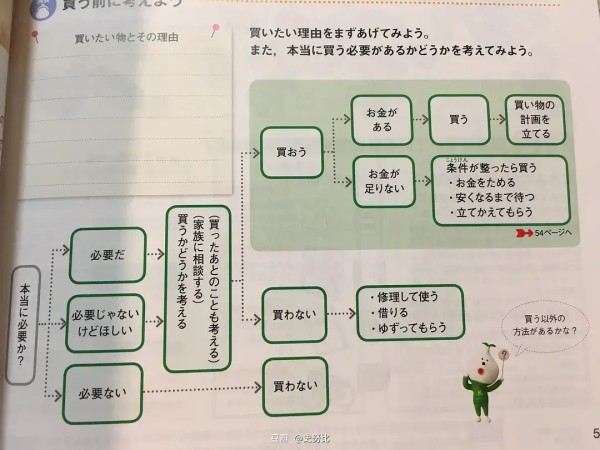 用:最让人惊奇的是,虽然是面向小学生,课本里已经有了关于理性购物的环节。要买一样新东西前,要考虑到底需不需要,如果确实想要,是攒钱买还是等到降价再买,不买的话,能不能修理现在的继续用、借用或者接受二手。从小接受这训练后,是不是将来可以避免成为被商业左右的“买买买”一族?
