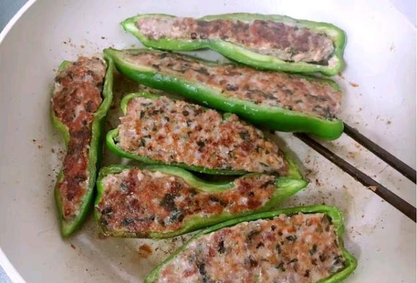 步骤4、起锅烧油,油热后放入辣椒酿肉,把肉的一面煎成金黄色,随后在锅中加入适量的清水,焖煮约10分钟的时间。