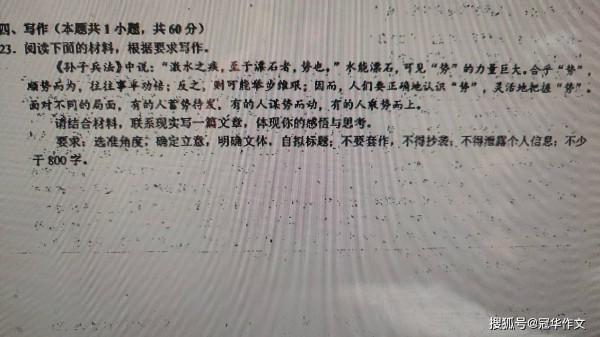 《孙子兵法》中说:“澂水之疾,至于漂石者,势也。”水能漂石,可见“势”的力量巨大,合乎“势”,顺势而为,往往事半功悟:反之,则可能举步维艰;因而,人们要正确地认识“势”,灵活地把握“势”。面对不同的局面,有的人蓄势待发,有的人谋势而动,有的人乘势而上,请结合材料,联系现实写一篇文章,体现你的感悟与思考。