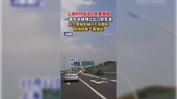 上海中环匝道口严重事故,一面包车疑错过出口欲变道,后方奔驰车躲闪不及翻车,前挡碎裂气囊弹出