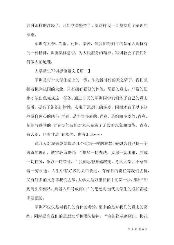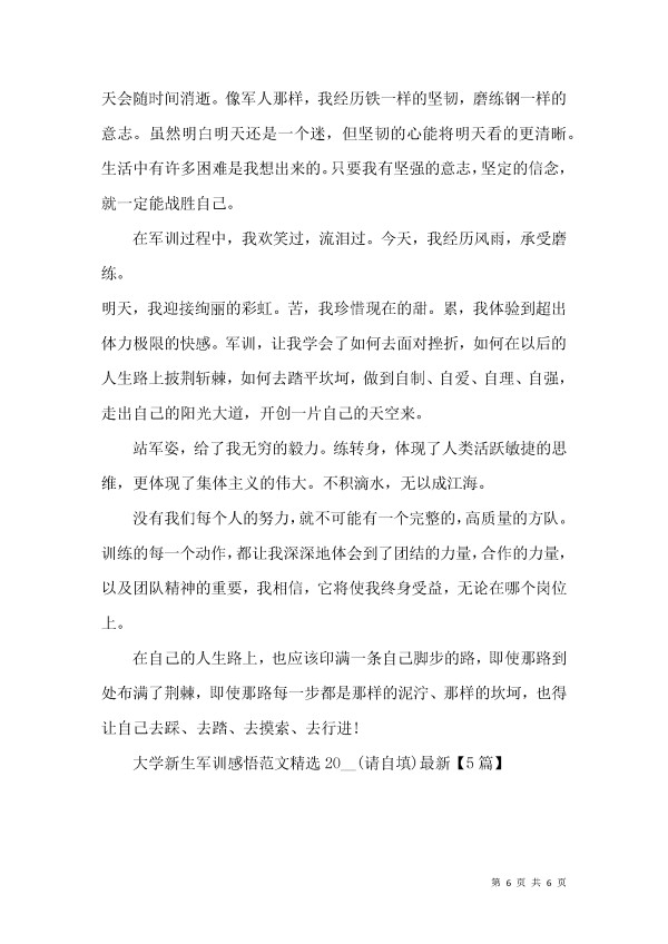 大学新生军训感悟范文20225篇大学新生军训感悟范文【篇一】军训在血与汗中完美结束了我们虽然在这流血流汗但却增强了自我的意志力吃苦耐劳的精神还有班级的凝聚力。军训总是埋怨时间过得太慢身体似乎受着“钢铁是怎样炼成的”般折磨教官又是冰一样的冷酷。可现在回想起来这五天的军训生活觉得种种烦恼是的多么的幼稚。军训是对我的一次洗礼也是一次挑战!我们差不多从小已习惯父母的宠爱所以军训意味着我们要学会集体生活自我照顾。军训第一天的训练是站军姿本以为这是一件很容易的事但真的做起来却很难不到一会我就觉得已近站不住了可不知道那教官是麻木了还是怎么了竟让我们站了好几分钟在加上太阳不停的幸灾乐祸的向我们泼洒着它的温暖蒸的我的体液犹如滔滔江水连绵不绝但教官还是不允许乱动我那时真的有些撑不住了真的好想大声的说“报告”但是话到了嘴边又咽了回去依然任凭那烈日熏烤站的脚底发痛。我还是决定坚实的踏出这关有事我真想向父母宣泄一下但我没有拿起电话因为我要学会自强将来的路是要我自己闯的于是我开始告诉自己要坚持。终于军姿站完了。我开始学我几乎不会的其他动作正步四面转法跑步等。第二天、第三天、第四天依然是这些枯燥的动作。但我却不像开始军训时那样的浮躁了开始学会坚持了。就这样我一直坚持到了军训的结束。军训有无奈、怨恨、付出、辛苦但我们得到了的是军人那特有的一种精神那就集体意识为人民服务的精神。军训教会了我们如何做人的道理。大学新生军训感悟范文【篇二】军训是每个大学生必上的一课作为新时代的天之骄子我们负担着振兴祖国的大业只有拥有强健的体魄坚强的意志严格的纪律才能出色完成这一任务。通过5天的军训同学们锻炼了自己的意志品质提高了组织纪律性实现了思想上的转变因而才有了以下这些发自内心的感言:青春是丰富多彩的;青春是绚丽多姿的;青春是朝气蓬勃的;青春期的我们对未来充满了无数的想象和期待。青春有苦涩也有甘甜;有欢笑也有泪水……这几天对我来说就像是几个世纪一样的难熬好想为自己找一个逃避的理由。教官教诲我们:“想尽一切办法克服一切困难完成一切任务争取一切荣誉。”我的思想开始转变考入大学并不意味着一劳永逸人生中有好多的关口要过有好多的责任等我们去抗又有好多的义务等我们去尽。大学只是万里长征中的第一步那种“船到码头车到站兵器入库马放南山”的思想对当代大学生的成长都是不建康的。军训不仅仅是对我们的身体的考验更多的是对我们的意志的磨练同时提高我们的思想水平和团队精神“宝剑锋从磨砺出梅花香自苦寒来”人是在不断的磨练中长大的就像一棵小树一样经历风雨后才能变成参天大树军人的气质和钢铁般的意志给我很深刻的印象正如一首军歌歌词描写的一样:“还硬比钢还强”.在我们军训中我们军人、学生一家人了解不少的军中生活体会到了军人的艰辛感受到了军人的豪迈气概他们肩负着保卫国家的重任苦中的乐教官说:“当兵后悔二年不当兵会后悔一辈子”.军人的奉献精神和大公无私深深的打动我们每个人我们的班主任给我们讲解生活中要注意的事项为我们今后的学习生活做准备。在这里有酸楚的泪水有苦咸的汗水有飘扬的歌声有欢乐的笑声这些就像不灭的音符跳动不已我们是充实的我们是快乐的苦与累已化作美与甜军训——我们不后悔军训已过去四天这四天中我的感触很深。感觉到我比以前坚强多了总觉得自己全身都是力量叠被子是我在军训四天中觉得最难的因为以前没有叠好过被子叠起来就头大怎么也叠不好尽管教官一而再的教可我还是叠不好使我都觉得我没有喝方面的天赋呵呵经过不懈的努力我最终还是会叠了军训中还有很多很多的感慨它们都会影响我的一生。感谢军训它教会了我很多以前没学到的东西。大学新生军训感悟范文【篇三】为期四天半的军训结束了我们班以一等奖画上了圆满的句号。在军训中我收获了很多也学到了很多。我学会了吃苦。在军训前我很自信我一定能轻松地完成训练任务可后来我发现军训并不像我想象的那么轻松站在火热的阳光下我的皮肤被烤得生疼在踢正步时因没掌握好动作要领总是容易踢上别人的手在踢步的时候腿和脚踢得酸痛可这一切我都忍住了现在回头看看觉得很有成就感。我学会了坚持在似火的骄阳下我觉得我整个人都快热得脱水了可我依然坚持着尽管十分难受可我从没有打报告休息当我最终坚持下来的时候我觉得我成功了我超越了自我。军训虽苦可苦中有乐当我们班以整齐的步伐走过阅兵台时当阅兵台上响起首长的鼓掌声时当宣布一等奖得主为我们班时有一种无法言表的快乐从我的心底里涌现出来分散到身体的每一个部分。“一份耕耘一份收获”当我们为军训付出汗水的同时我明白了潇洒帅气的齐步、正步不是一天练成的;明白了冰冻三尺非一日之寒;长江虽险非一川之功;明白了努力才有结果。