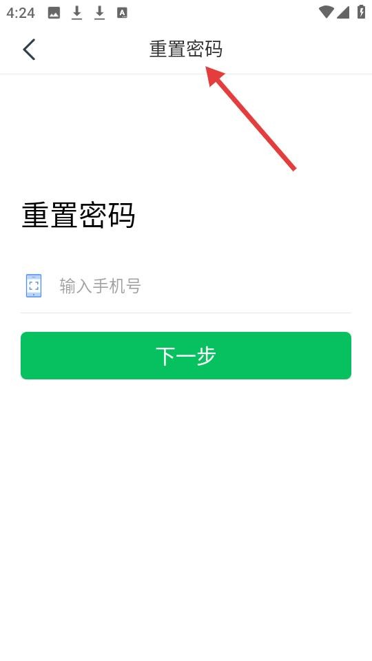 2、点重置密码页面,标题醒目,用户可在此输入手机号,点击下一步进行密码重置操作。